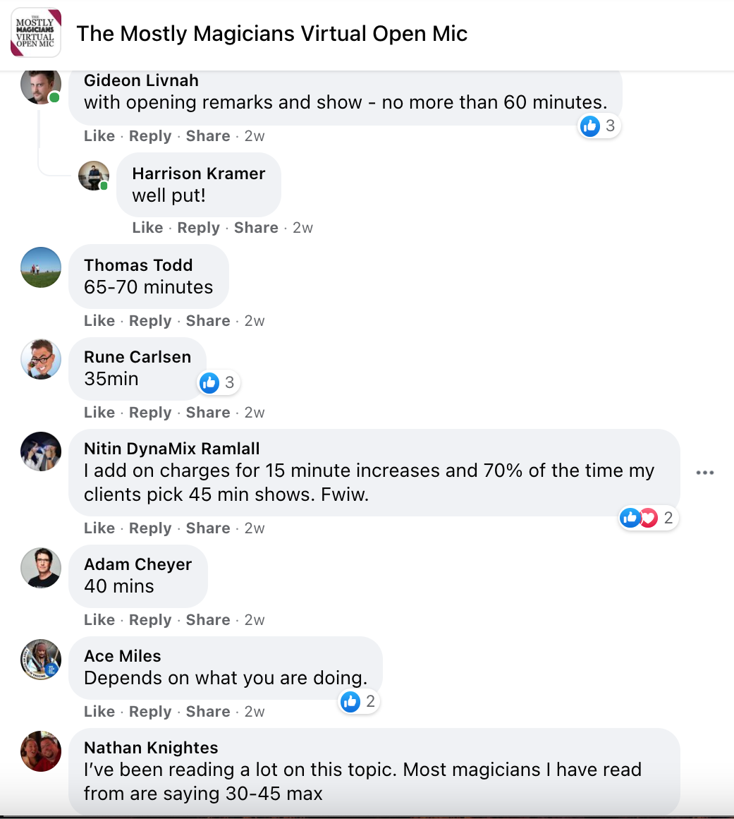 Since the group is (as the name suggests) mostly magicians such as myself, I was expecting suggestions of hour long virtual events. And there were some. But most of the responses looked like this: