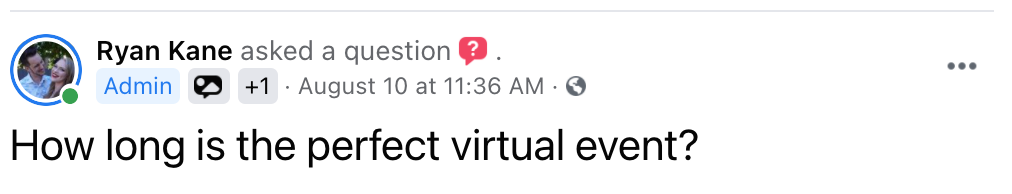 So there you have it. The consensus seems ot be that the entire virtual event should be less than an hour long. The main activity, such as a virtual magic show, seems to last for about 40 minutes of that time.