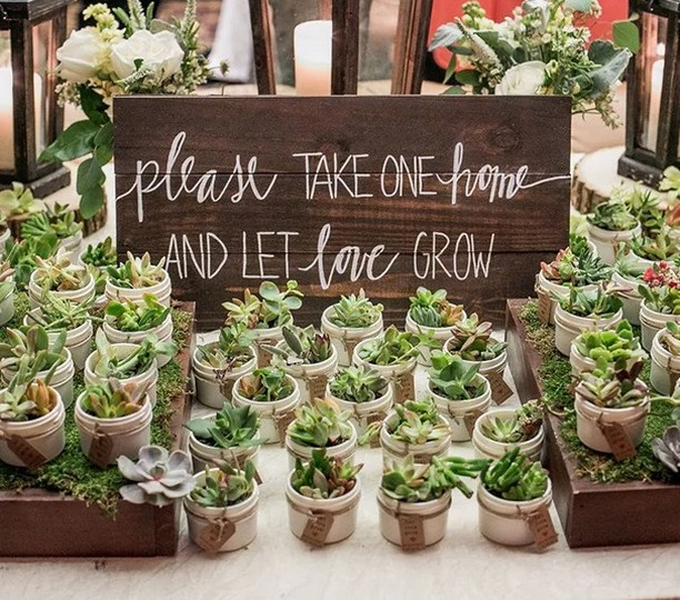 Succulents are fun and (surprisingly easy) way for your guests to remember your special day. A custom caricature drawing ticks the novel wedding favor box nicely as well.